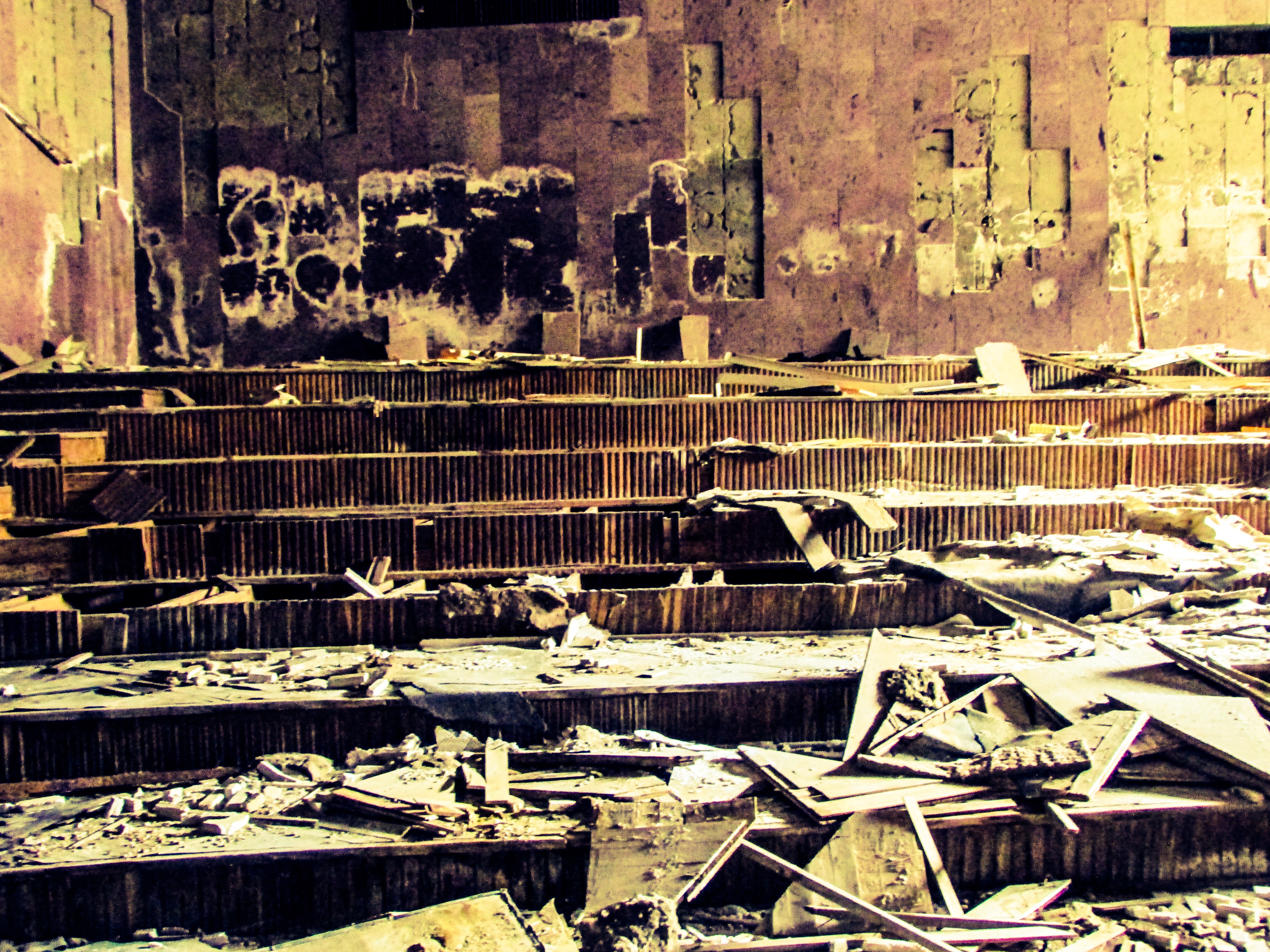 På noen av veggene er fortsatt deler av veggmaleriene tydelig og i idrettshallen ser man både håndballmål og tribuner.